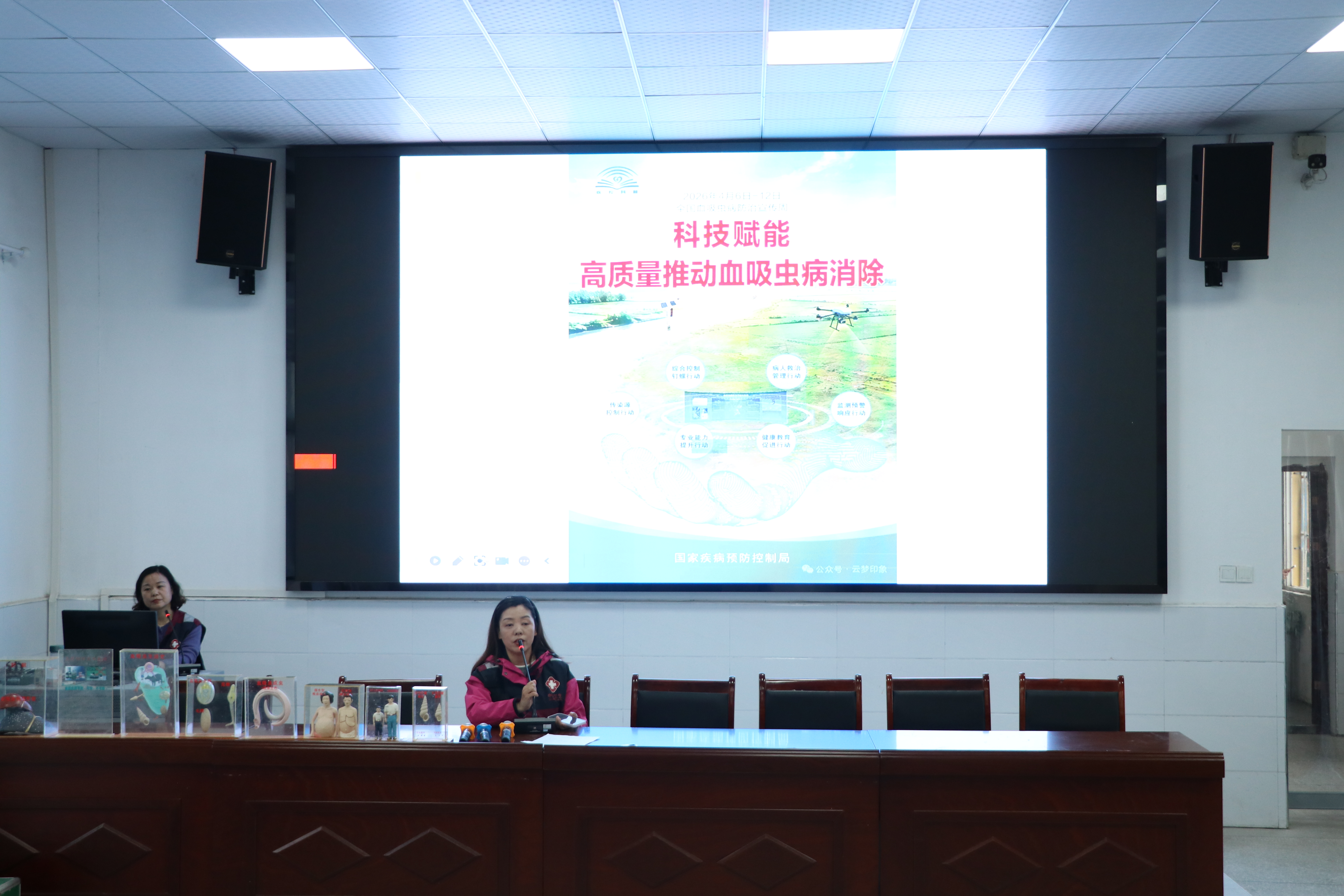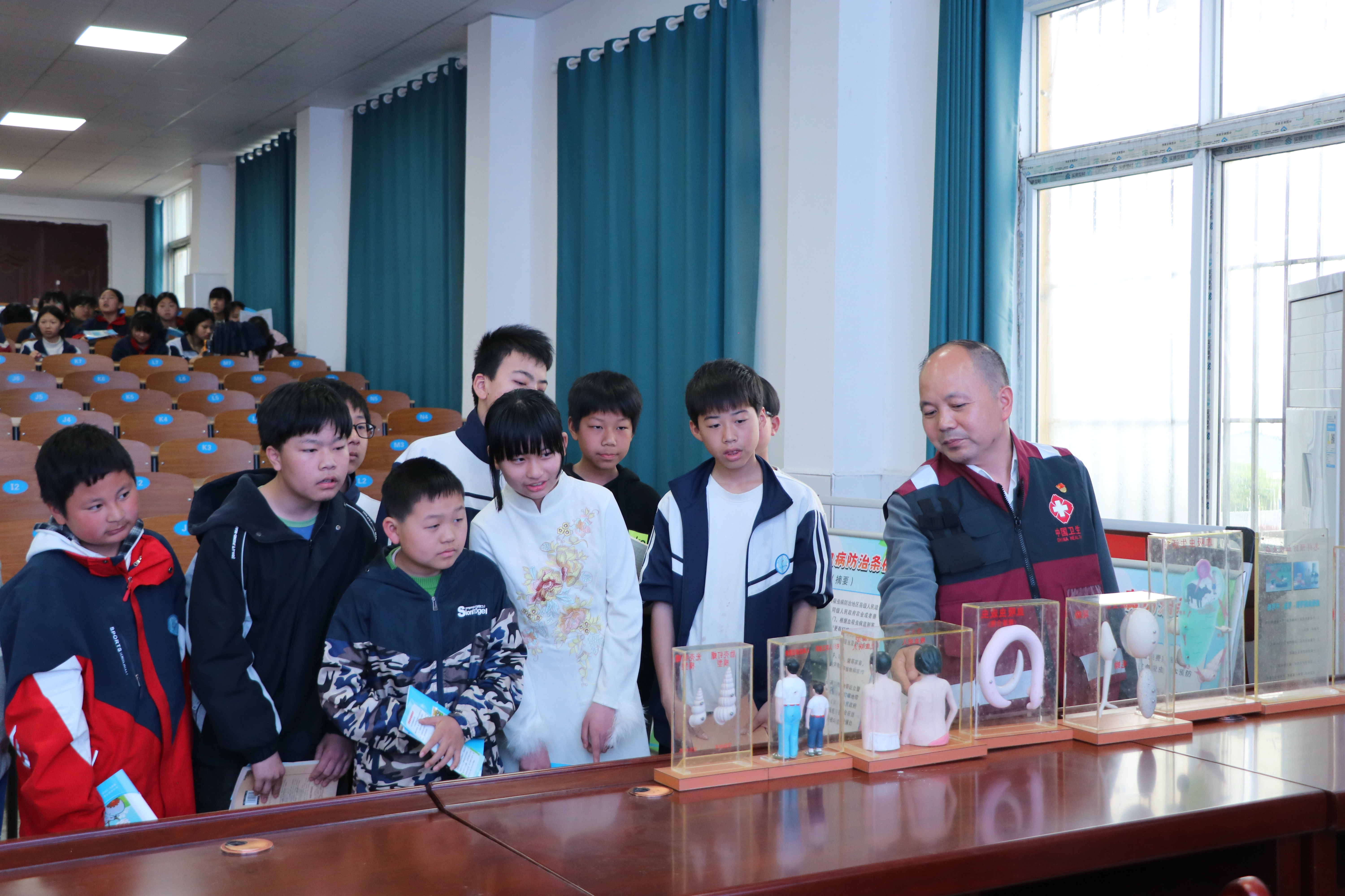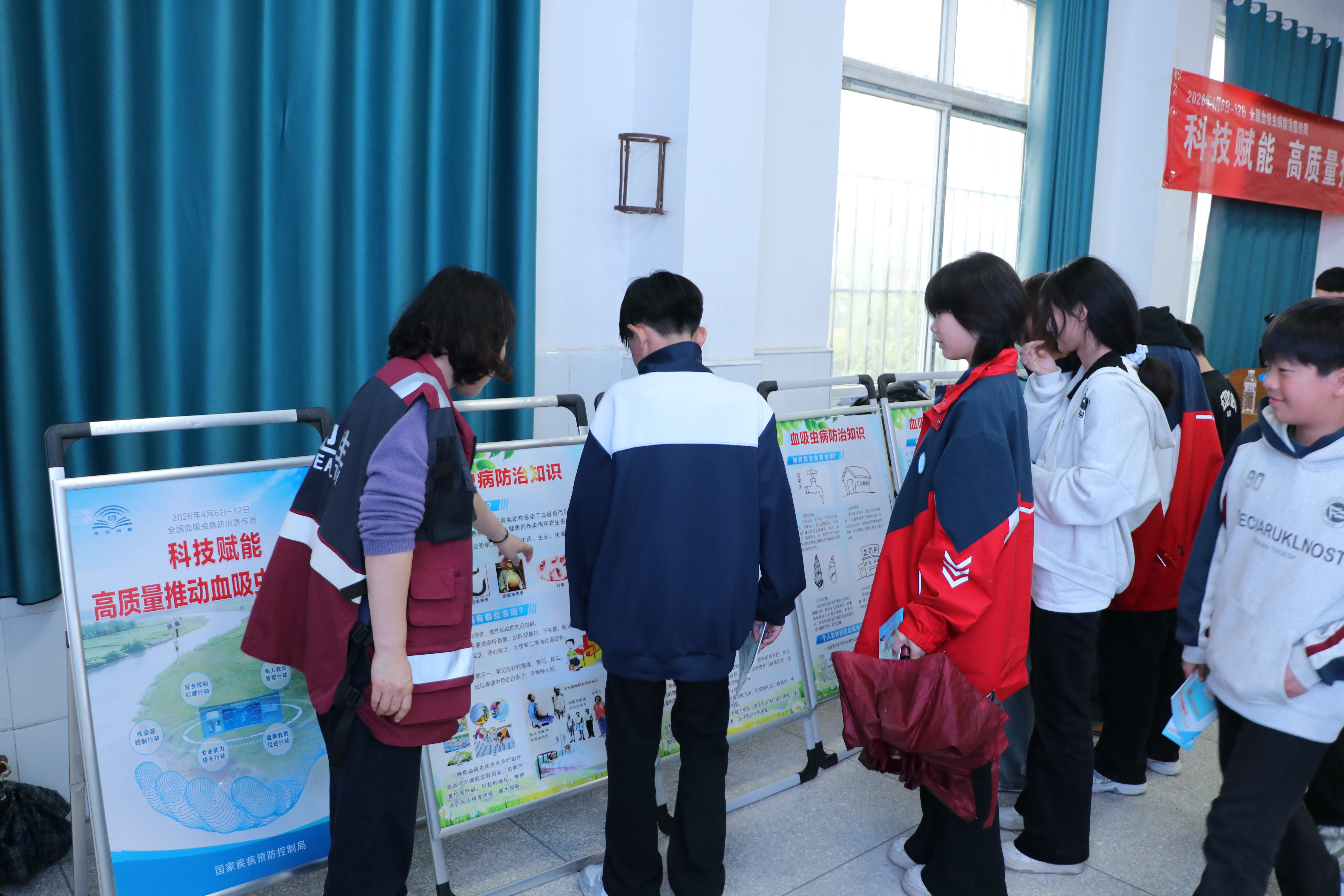 活动现场,工作人员通过悬挂横幅、摆放展板、发放科普手册、现场讲解等多种形式,向学生普及血吸虫病防治知识。