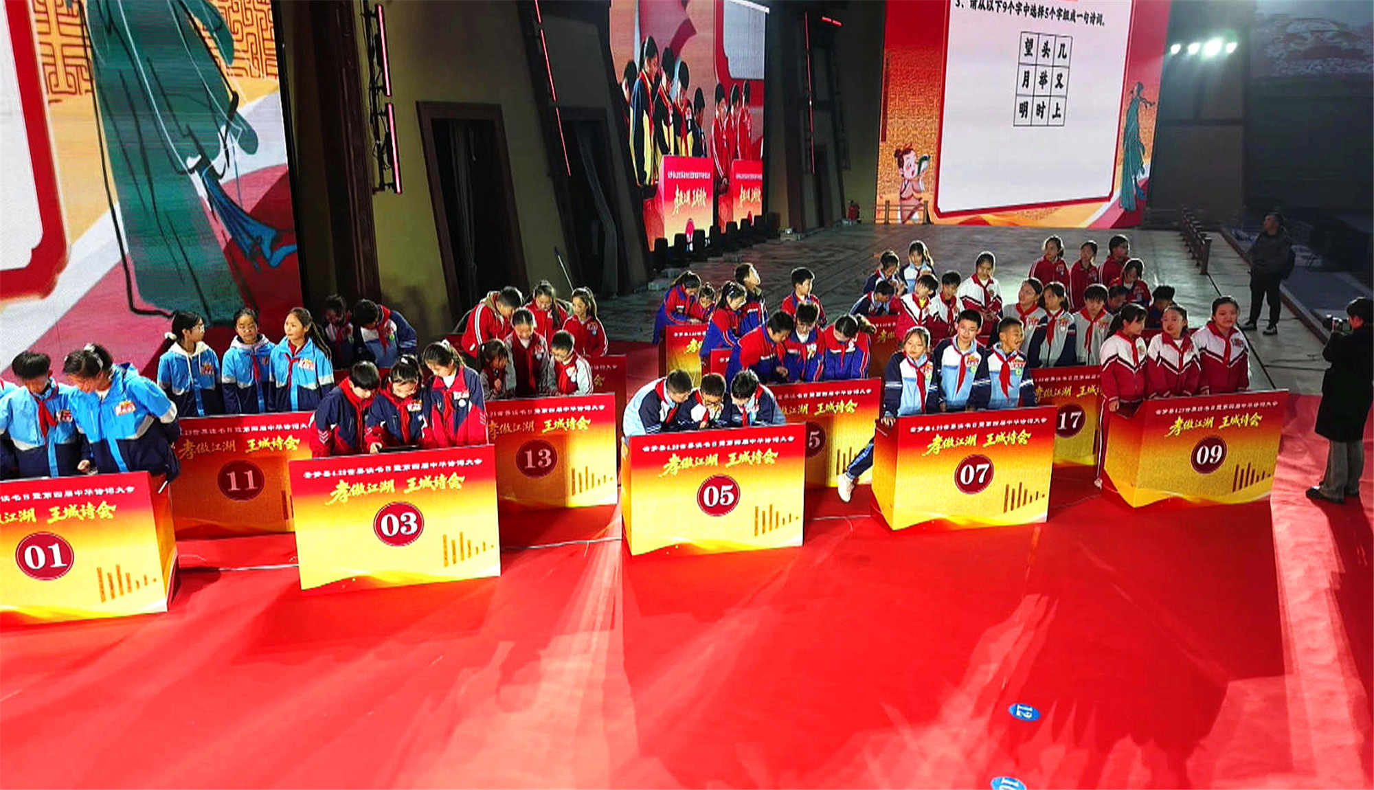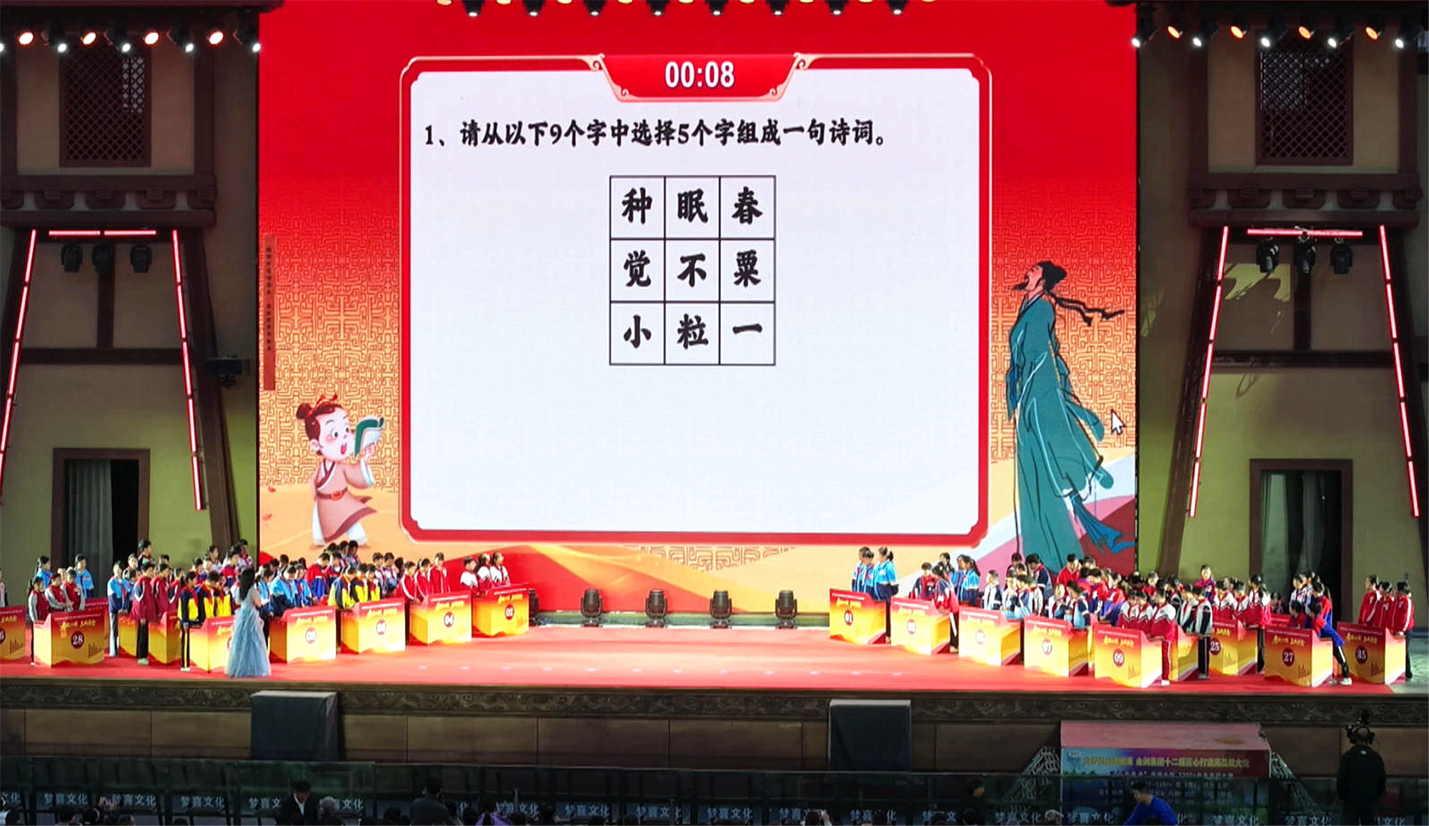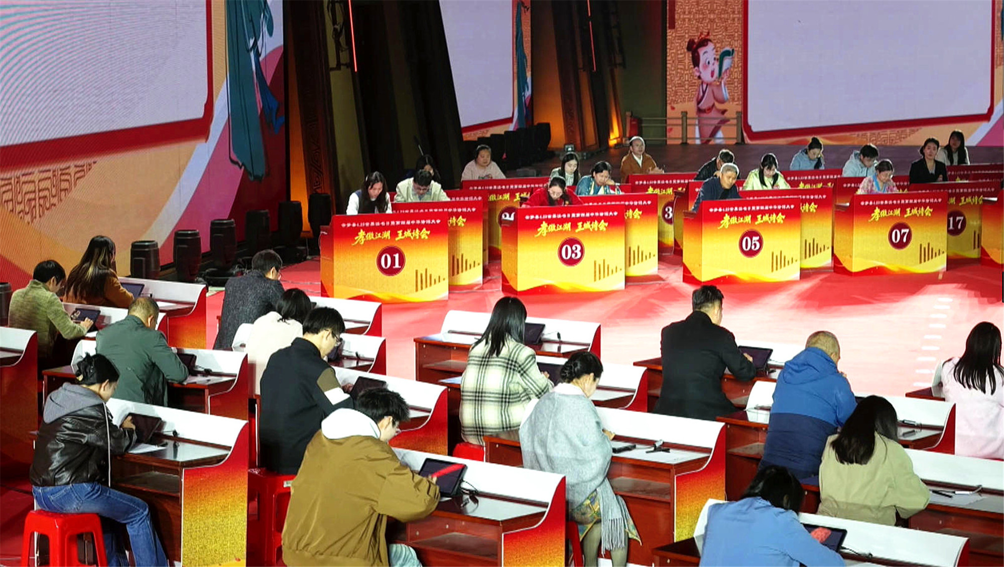 夜幕降临,楚王天下大舞台诗声琅琅、掌声阵阵,诗词大会决赛在此正式拉开帷幕。赛事创新设置少儿组团体赛和成人组个人赛两条赛道,包含突围赛、晋级赛、半决赛与争霸赛四轮激烈交锋。九宫格、十二宫格、诗词抢答、关键字联诗等题型轮番上阵,既深度考验选手的诗词储备,也全方位比拼其临场应变能力。赛场之上,选手屏息凝神,抢答环节扣人心弦;大屏幕同步实时刷新战况,系统自动计分排序,将竞技氛围推向高潮。