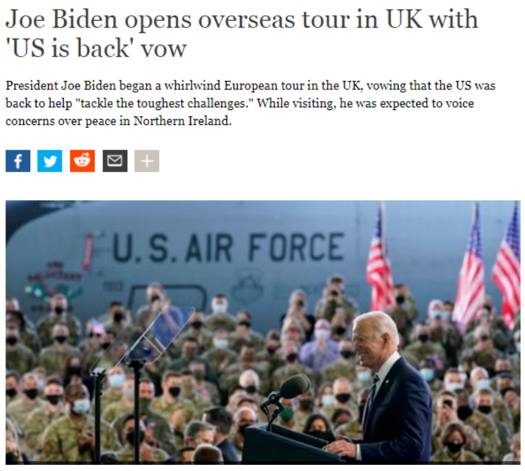 舆论普遍相信,从首站英国开始,拜登在此次长达8天的“豪华”行程中的主要目标之一,就是借七国集团峰会、北约峰会、美欧峰会等“盟友平台”不断重复“美国回来了”的口号,以寻求修复过去几年严重受损的美欧关系。