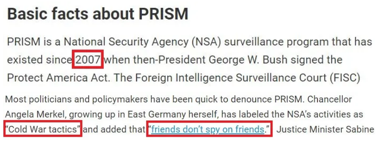 早自2007年起,美国国家安全局(NSA)就开始实施所谓“棱镜计划”,广泛监听国内外电话和互联网通信。该计划2013年被斯诺登曝光后,长期遭受监控的德国总理默克尔怒指NSA的活动为“冷战伎俩”,提醒美国“朋友不会监视朋友”。
