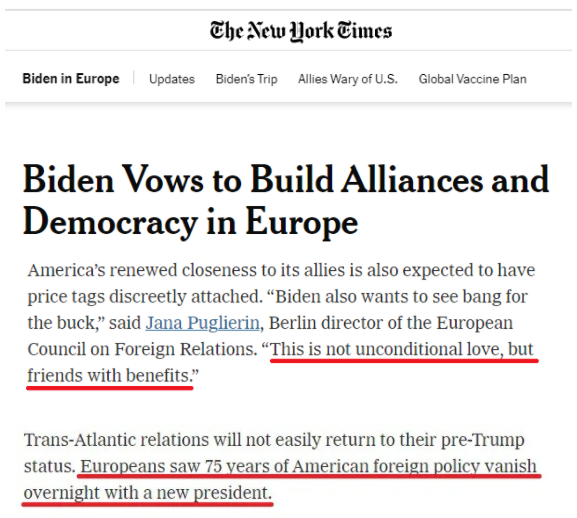 《纽约时报》援引欧洲对外关系委员会驻柏林负责人亚娜·普格里林的话指出,美国只是欧洲的一个“讲利益的朋友”,不会给予欧洲“无条件的爱”。“欧洲刚刚目睹了美国战后75年的外交政策如何随着像特朗普这样的总统上台在一夜之间消失”,很难再轻易相信白宫主人。