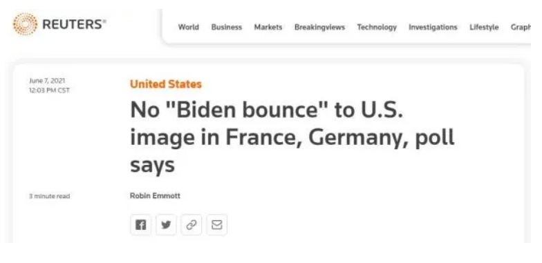 美欧两家智库在拜登访欧前联合发布的民调结果显示,德国和法国民众对美国国际影响力的看法“并未随着拜登的上台而改变”。
