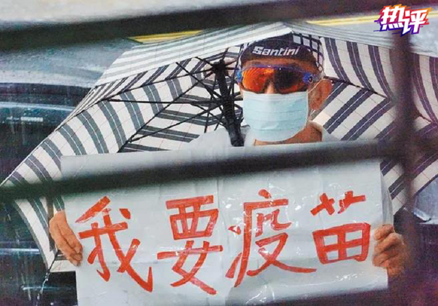 △台湾民众拿着“我要打疫苗”的牌子