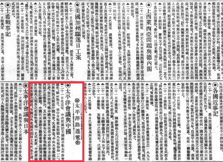 1921年7月23日《申报》上的消息《太平洋会议与中国》。新华社发(上海图书馆提供)