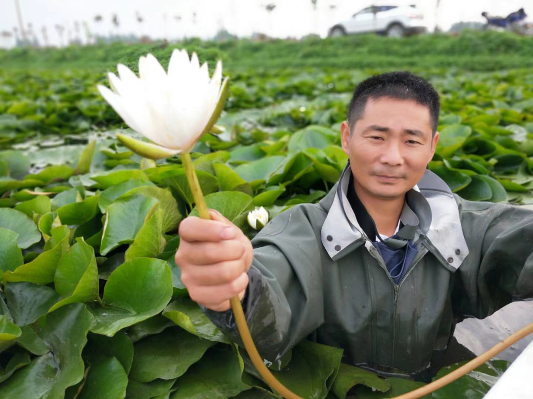 炎炎夏日,正是睡莲采收的季节。刘伟穿着下水衣,一伸手熟练地采起一朵莲花,小心地拔起。