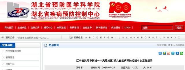 辽宁省沈阳市新增一中风险地区 湖北省疾病预防控制中心紧急提示 7月24日,辽宁省沈阳市新增1例本土新冠肺炎确诊病例,2例本土无症状感染者。7月25日,辽宁省沈阳市大东区一地升级为中风险地区。为科学精准防控疫情,严防疫情输入,现对广大群众提出如下疫情防控建议: 一、2021年7月15日(含)以来从辽宁省沈阳市大东区来鄂返鄂的人员,请主动到当地社区进行健康申报,并配合当地疫情防控指挥部的所有防控措施。如有疑问可拨打我省各级疾控中心咨询热线,号码附后。 二、鉴于辽宁省沈阳市当前的疫情形势,如无必须,建议近期不要前往。 三、从辽宁省沈阳市来鄂返鄂的人员,请提前了解我省当地防控要求;来鄂返鄂途中,请做好个人防护;来鄂返鄂后,应主动配合我省相关防控措施。 四、广大群众要继续时刻保持良好的个人防护意识,养成随身携带口罩,科学规范佩戴口罩(尤其是在乘坐公共交通工具和在公共场所活动时)、勤洗手、常通风、保持安全社交距离的卫生习惯;不扎堆、不聚会,倡导健康生活方式。 五、如出现发热、咳嗽、腹泻、乏力等症状,要佩戴一次性医用口罩及以上级别口罩,及时到就近的发热门诊进行排查和诊疗,就医过程尽量避免乘坐公共交通工具。 六、接种新冠疫苗是预防控制新冠肺炎传播的最经济、最有效、最方便的措施,更是每一位公民应尽的责任和义务,请符合新冠疫苗接种条件的群众积极主动参与新冠病毒疫苗接种,携手共筑全民免疫屏障。