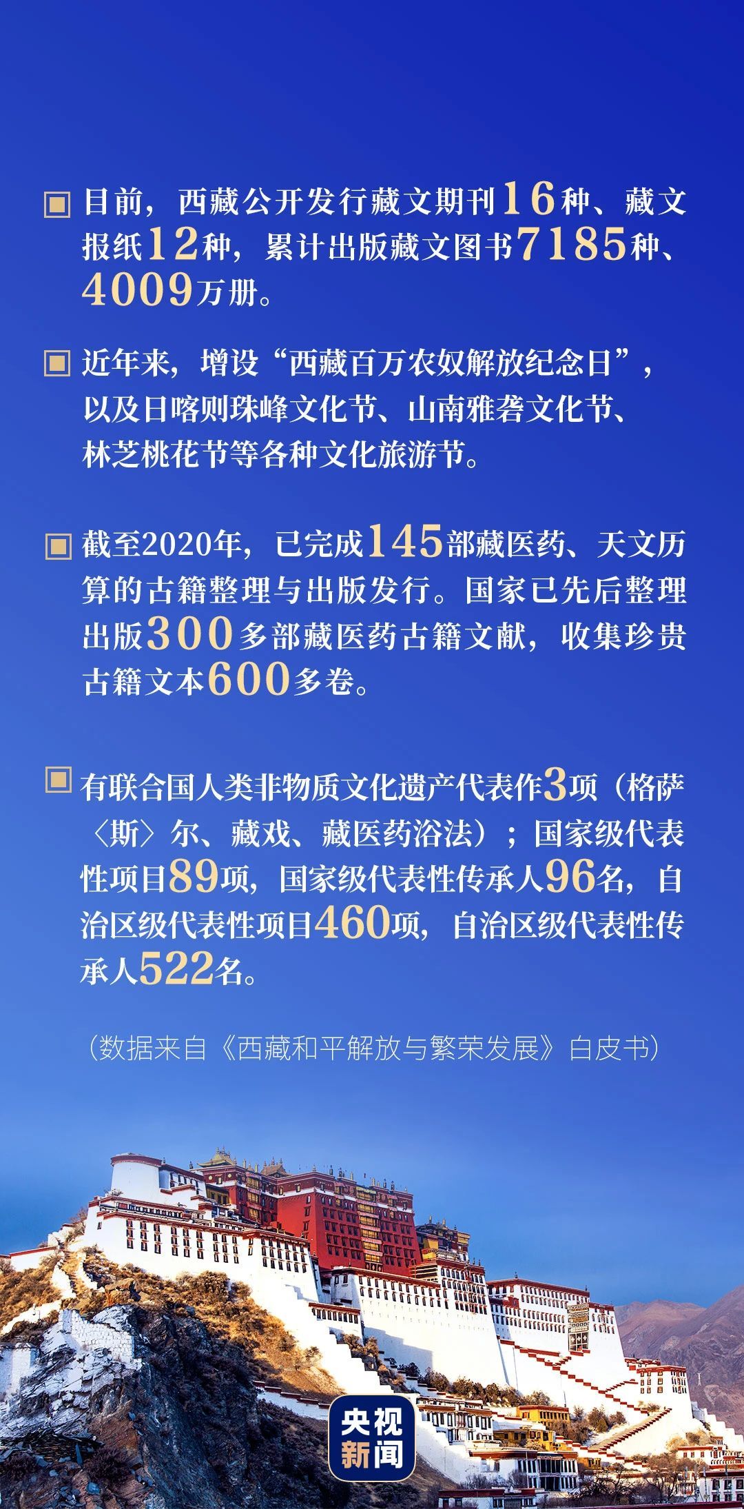 布达拉宫广场是西藏历史文化和发展成就的缩影。2018年底,我国启动了周期10年、投资3亿元的布达拉宫文物(古籍文献)保护利用项目。如今,藏历新年、拉萨雪顿节、那曲赛马节等一大批群众性文化传统节庆得到继承和创新;林芝桃花节等各种文化旅游节,丰富了广大人民群众的精神生活,展现了新时代西藏人民积极向上的精神风貌。