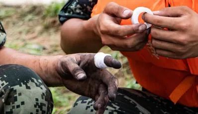 这是一双抗洪一线武警指战员的手,泥泞的双手布满新旧伤痕。在卫生员的一再请求下,他才停下,简单包扎,又回到大堤上奔忙的队伍中。