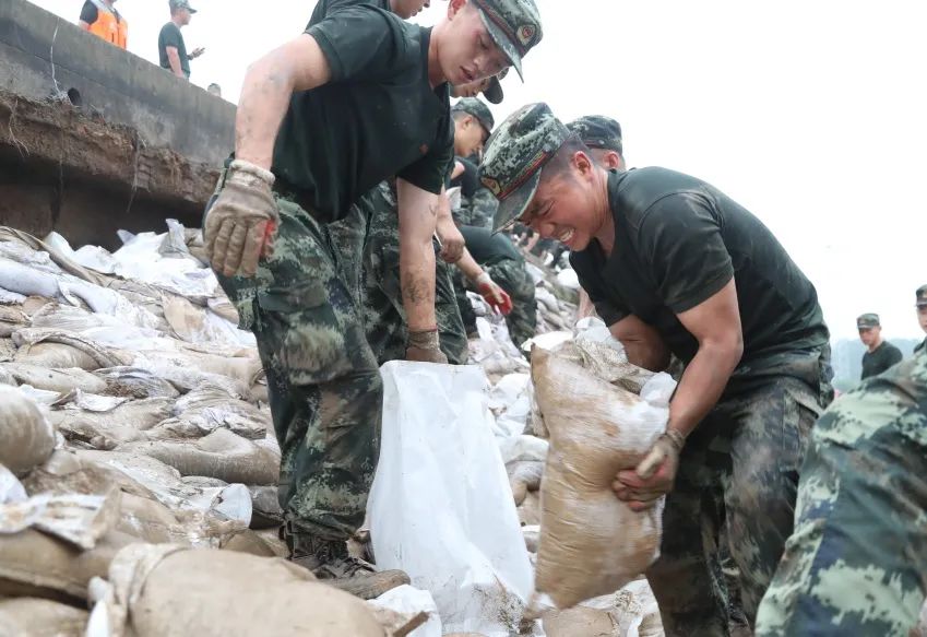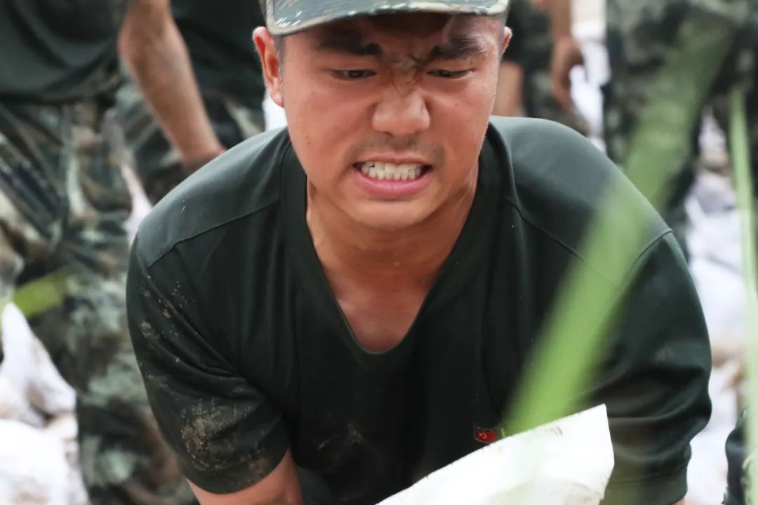 这是一张“00后”士兵的脸,大堤上,他咬紧牙关,眉头紧锁,低下身子,吃力地举起沙包往肩上送。那张黝黑的脸憋得通红,汗水顺着脖子往下淌,军装早已湿透。