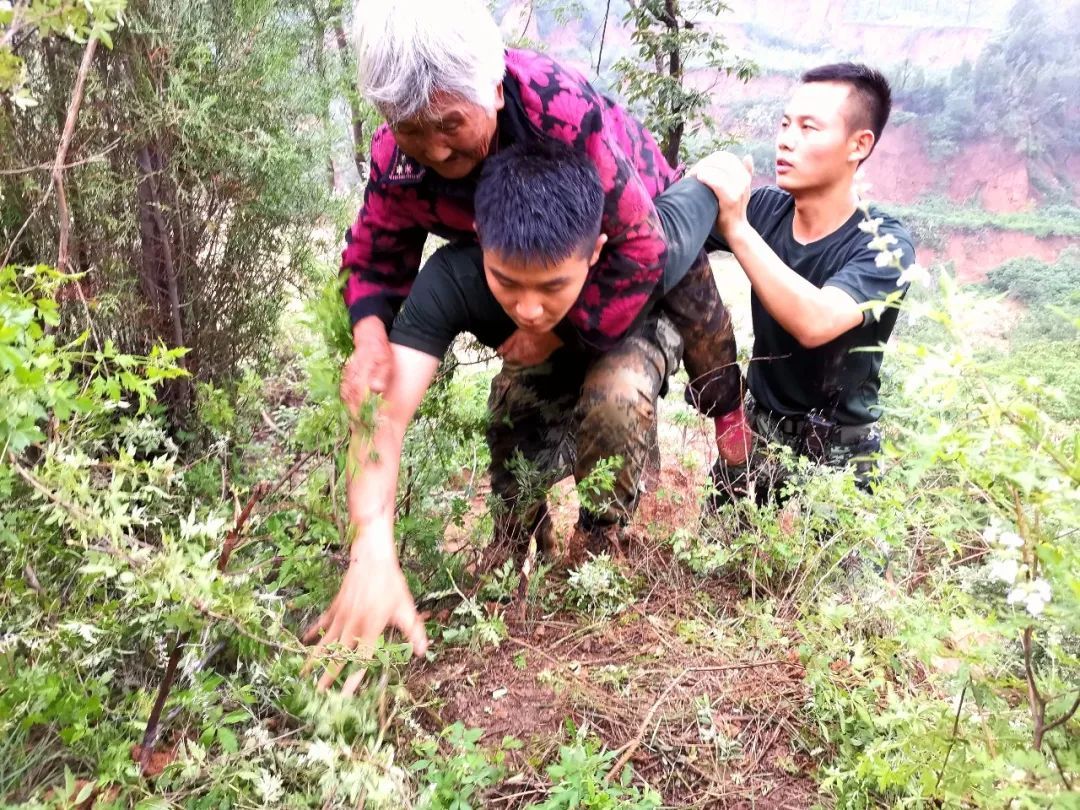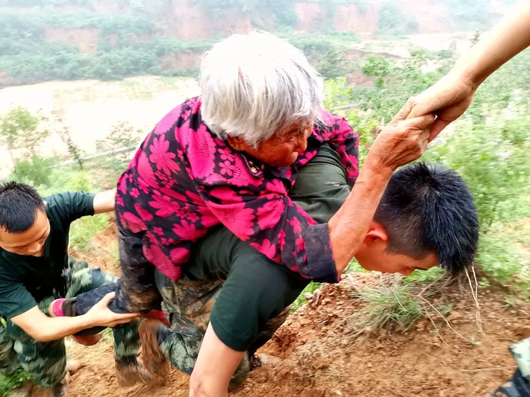 年轻的武警战士用力地弯下腰来,肩背稳稳地托起白发苍苍的老人,手脚并用艰难地在泥泞的山路跋涉。