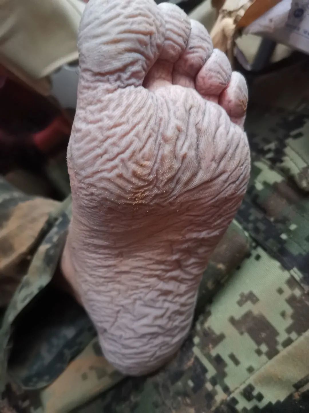 这是一双在洪水中连续奋战的老班长的脚,这双脚被积水浸泡得发白、皲裂。