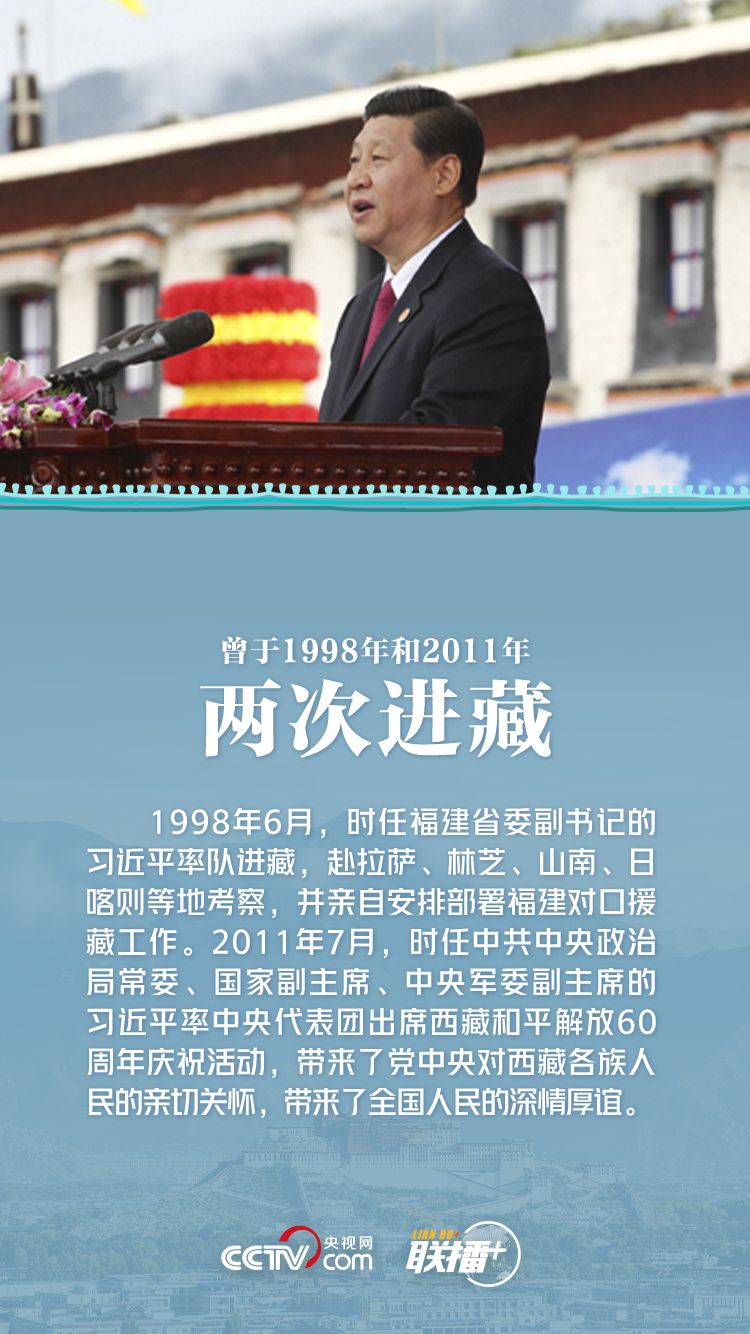 习近平总书记始终心系西藏。早在1998年6月,在福建工作时,习近平就因对口援助任务而来到西藏考察。2011年7月,习近平作为中央代表团团长,出席西藏和平解放60周年庆祝活动。党的十八大以来,以习近平同志为核心的党中央立足实际,着眼长远,围绕西藏经济社会发展和长治久安大计,作出一系列重大决策部署,谱写出雪域高原中国梦的新篇章。