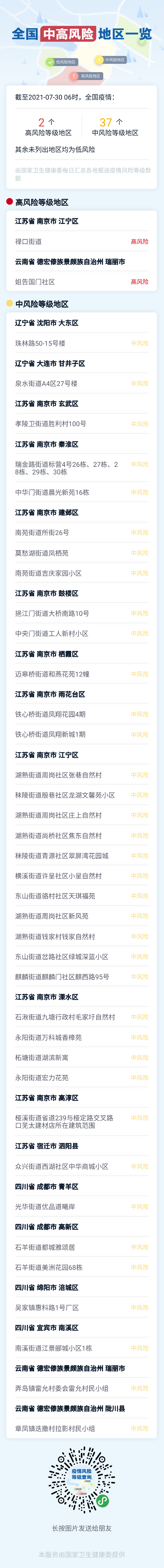 截至2021年7月30日6时全国共有高风险地区2个中风险地区37个