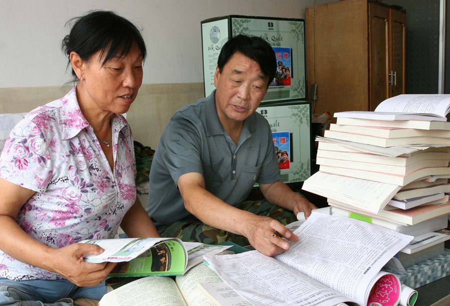 这是张连印和妻子一起查阅资料,学习植树造林和防风治沙知识(2007年9月1日摄)。新华社 刘松峰摄