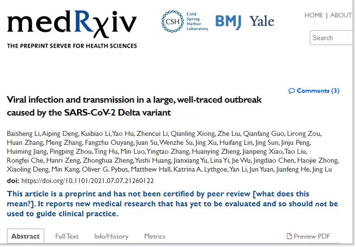 ▲7月12日,中国广东省疾控制中心的一组研究人员在medRxiv预印本平台发布的研究论文指出,德尔塔毒株感染者的呼吸道病毒载量是原始毒株感染者的1260倍。截图自medRxiv