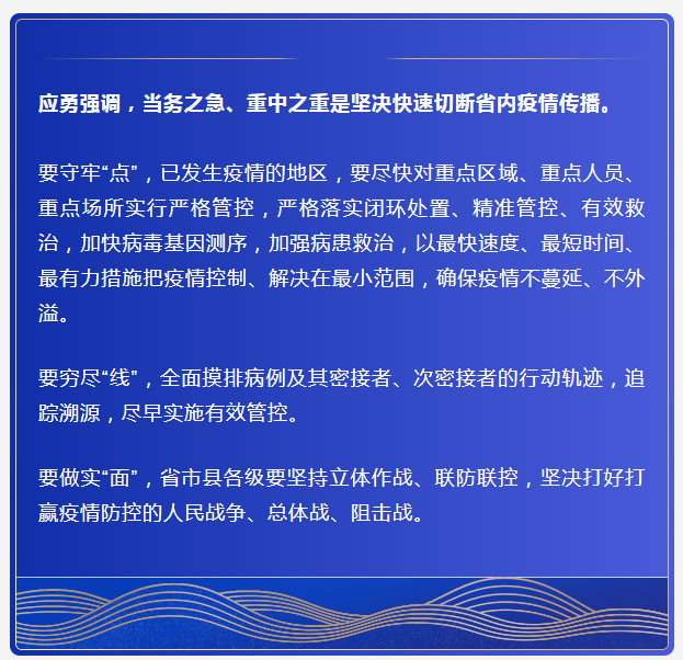 省委书记、省疫情防控指挥部指挥长应勇指出,应对此轮疫情,要把握“快、狠、严、扩、足”要求。
