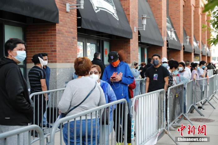 资料图:美国纽约大都会棒球队主场花旗球场新冠疫苗接种点,民众排队接种疫苗。中新社记者 廖攀 摄