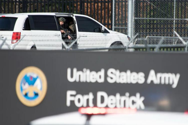 资料图片:4月6日,特警人员准备进入美国马里兰州弗雷德里克市的德特里克堡军事基地。新华社/美联