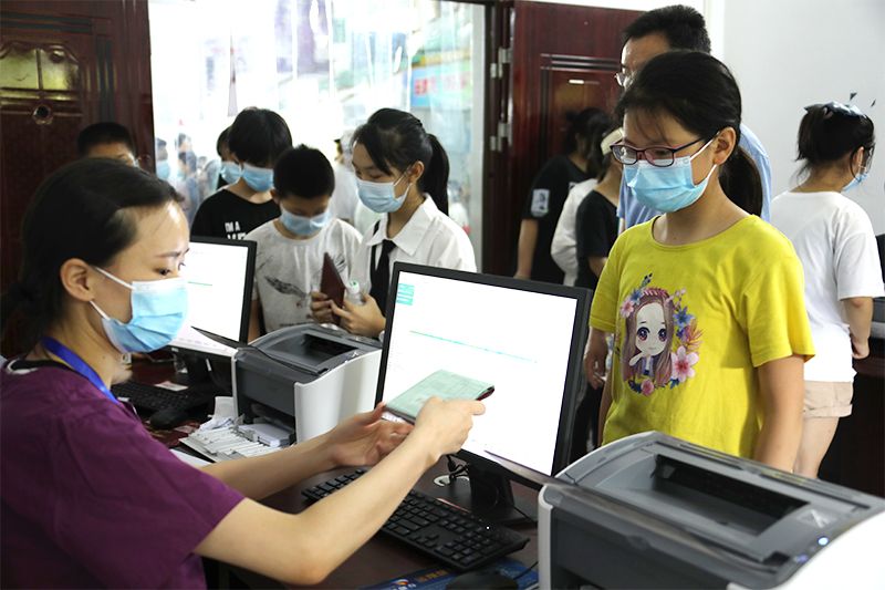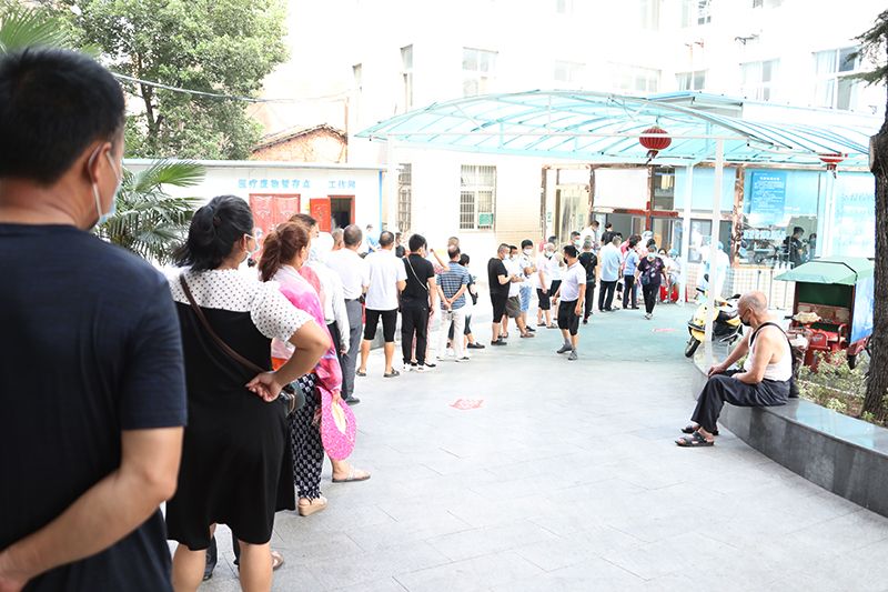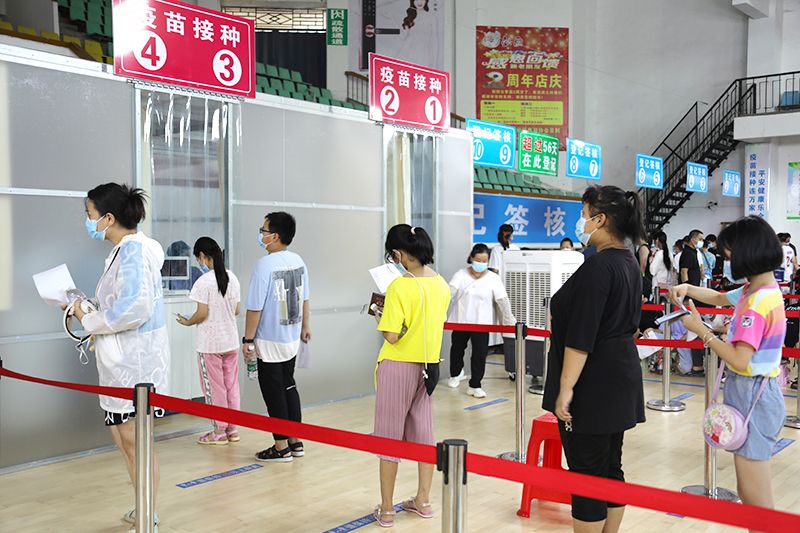8月3日下午,在云梦体育馆方舱接种点,12—17周岁接种的学生在老师的指导下,有序排队登记、接种。