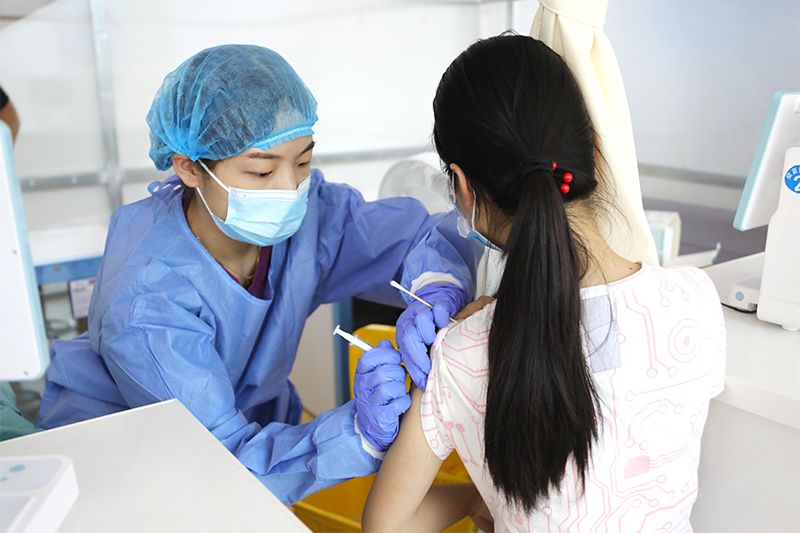 接种区的医护人员一刻也闲不下来,每天坐在位置上十多个小时,连续不断地去做重复的工作,不停地说话,期间不能喝水或者去洗手间。虽然看似事小简单,却蕴含着白衣工作者一颗坚守使命的责任心。