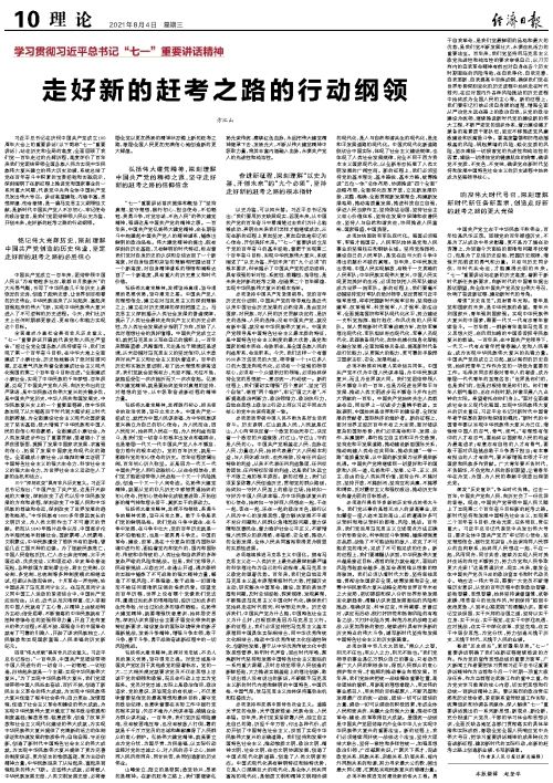 习近平总书记在庆祝中国共产党成立100周年大会上的重要讲话(以下简称“七一”重要讲话),站在历史和全局的高度,全面回顾了我们党一百年走过的光辉历程,高度评价了百年来我们党团结带领全国各族人民为实现中华民族伟大复兴建立的伟大历史功绩,系统总结了党在百年奋斗中积累的宝贵经验和实践启示,深刻阐明了在新征程上推进党和国家事业的一系列重大问题,代表党中央向全体中国共产党员发出伟大号召。讲话高屋建瓴、内涵丰富,思想深邃、饱含激情,是一篇马克思主义纲领性文献,是新时代中国共产党人不忘初心、牢记使命的政治宣言,是我们党团结带领人民以史为鉴、开创未来,走好新的赶考之路的行动纲领。