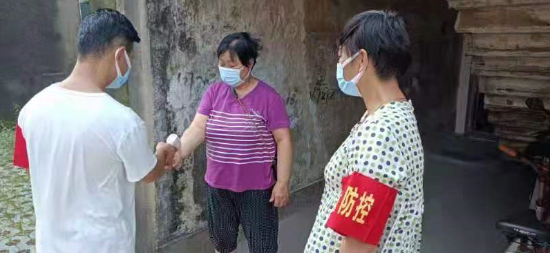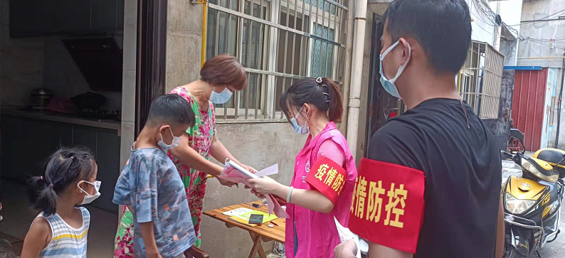 8月7日,记者在城关镇黄湖社区看到,社区工作者上门给低风险区返回居民测量体温,并分发居家隔离告知书。